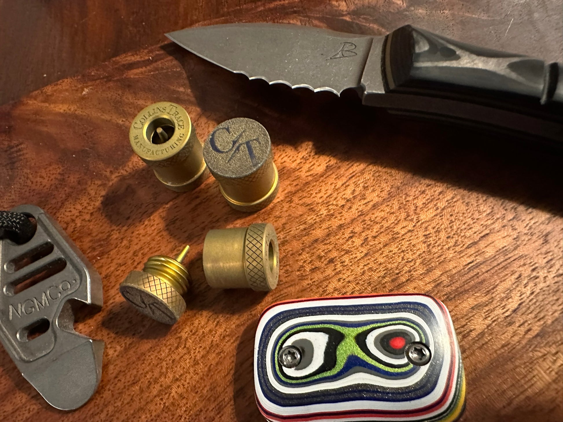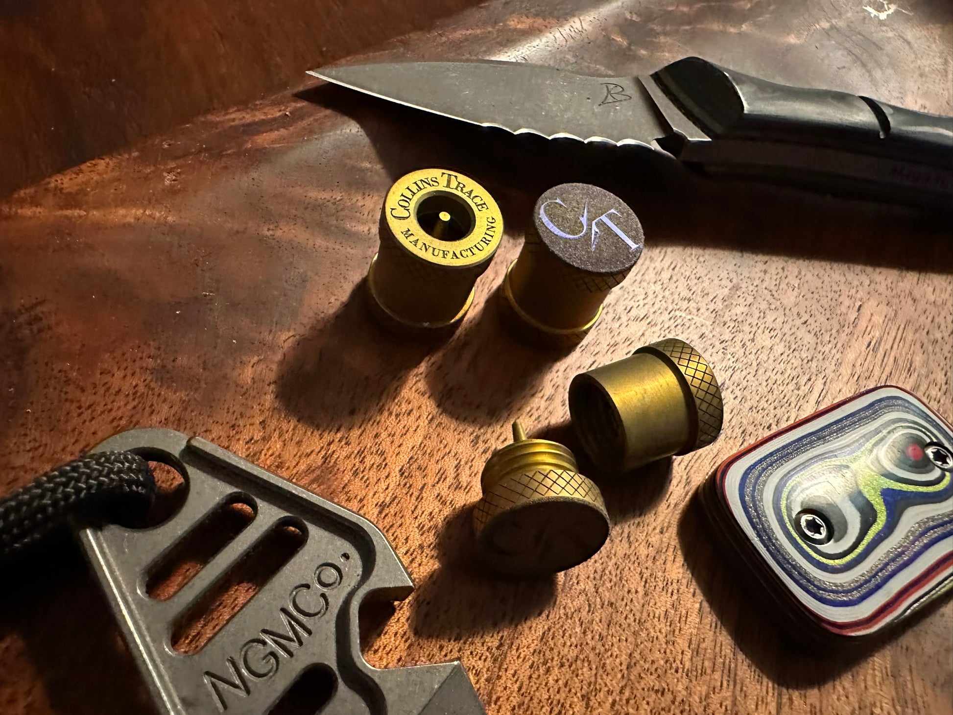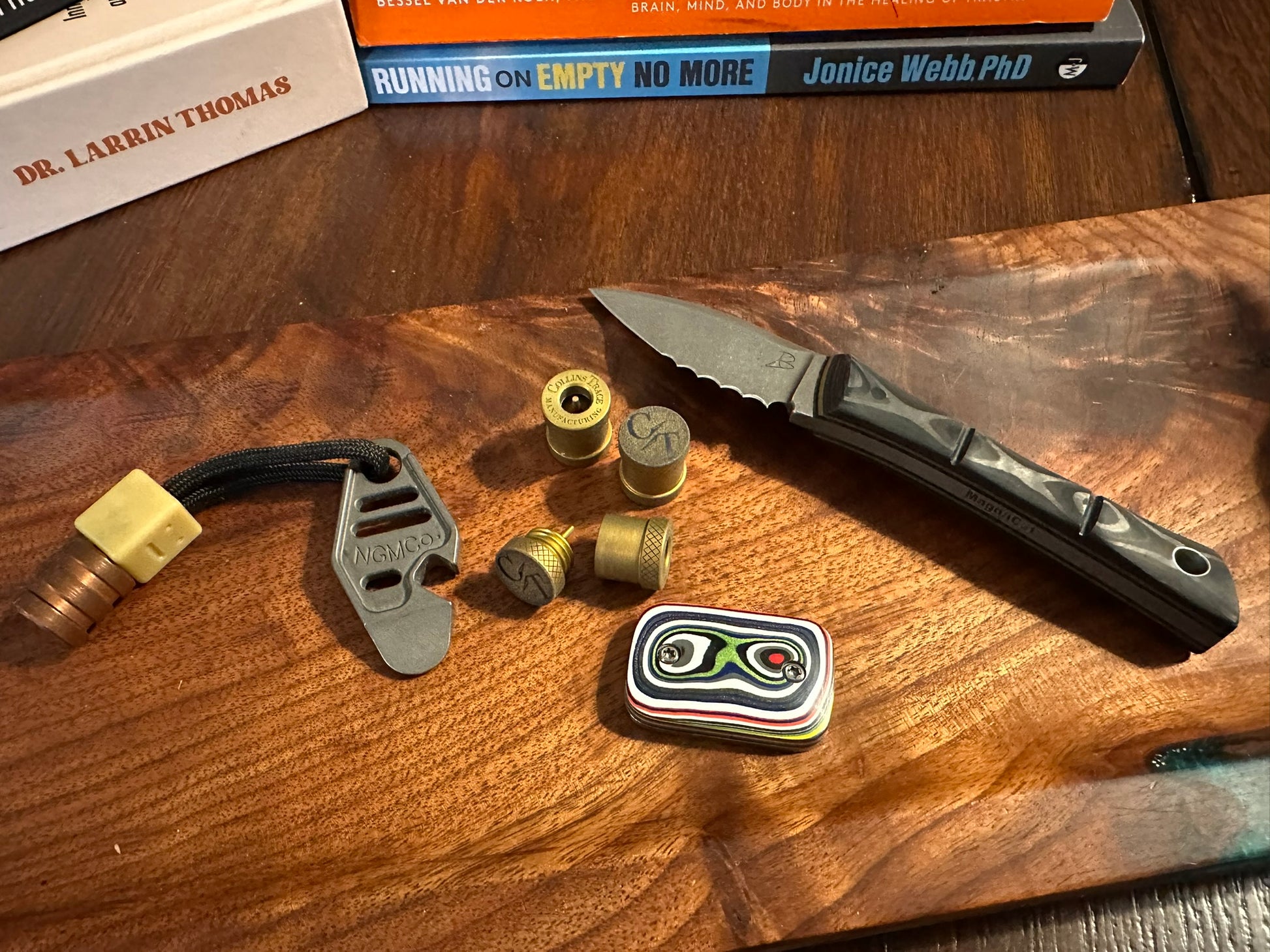 This gold anodized titanium The End Bead made with lasered knurling and reversed purple anodized logo. It clean and vibrant to add to your EDC items.